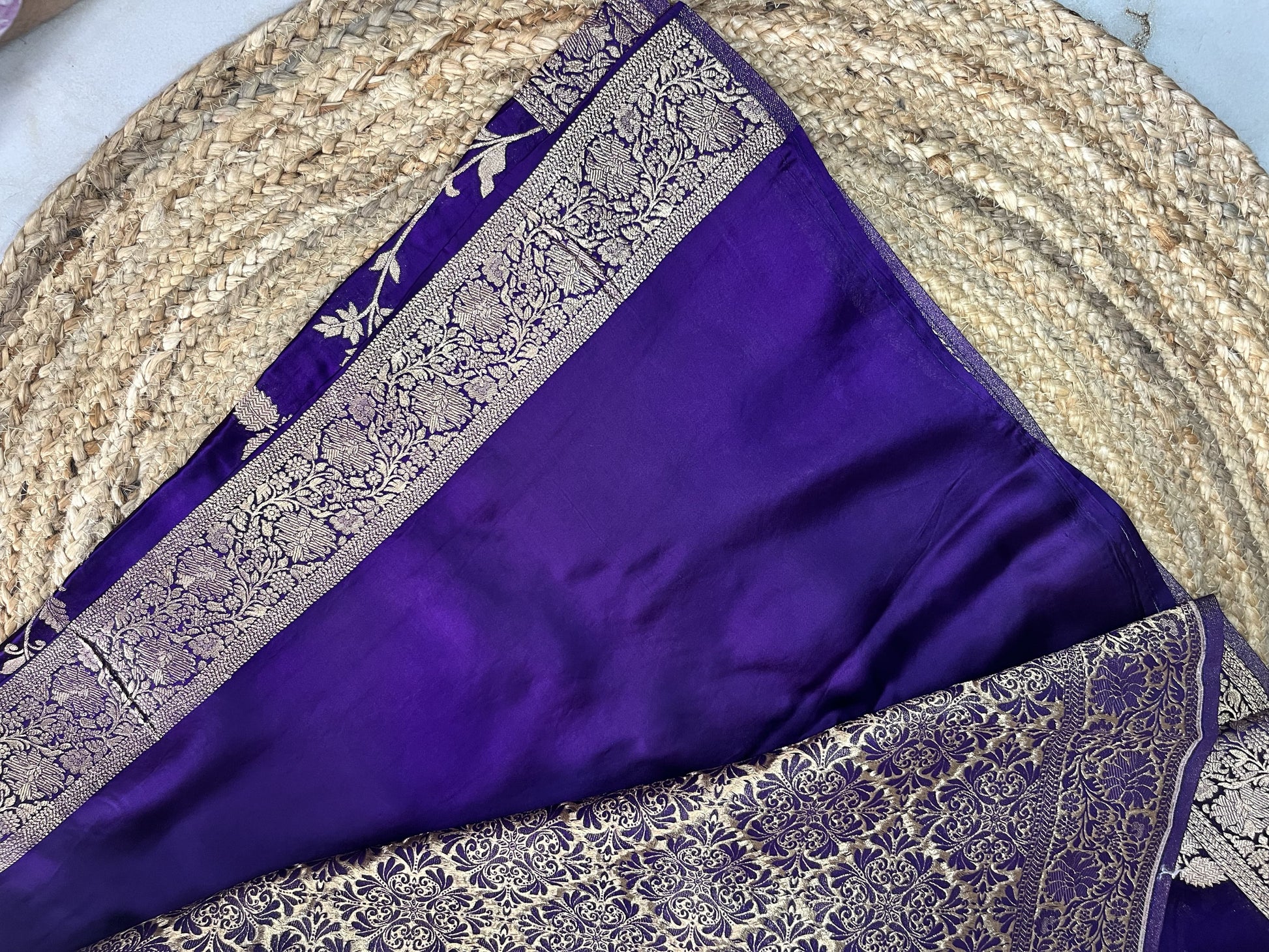 Wrap yourself in the richness of tradition with this stunning Premium Banarasi Mashru Silk Saree from Kanasu. Known for its luxurious texture and subtle sheen, Mashru silk blends the softness of silk with the comfort of cotton. Adorned with intricate Banarasi weaving, this Blue purple drape is a graceful blend of heritage and elegance — perfect for festive and formal occasions.