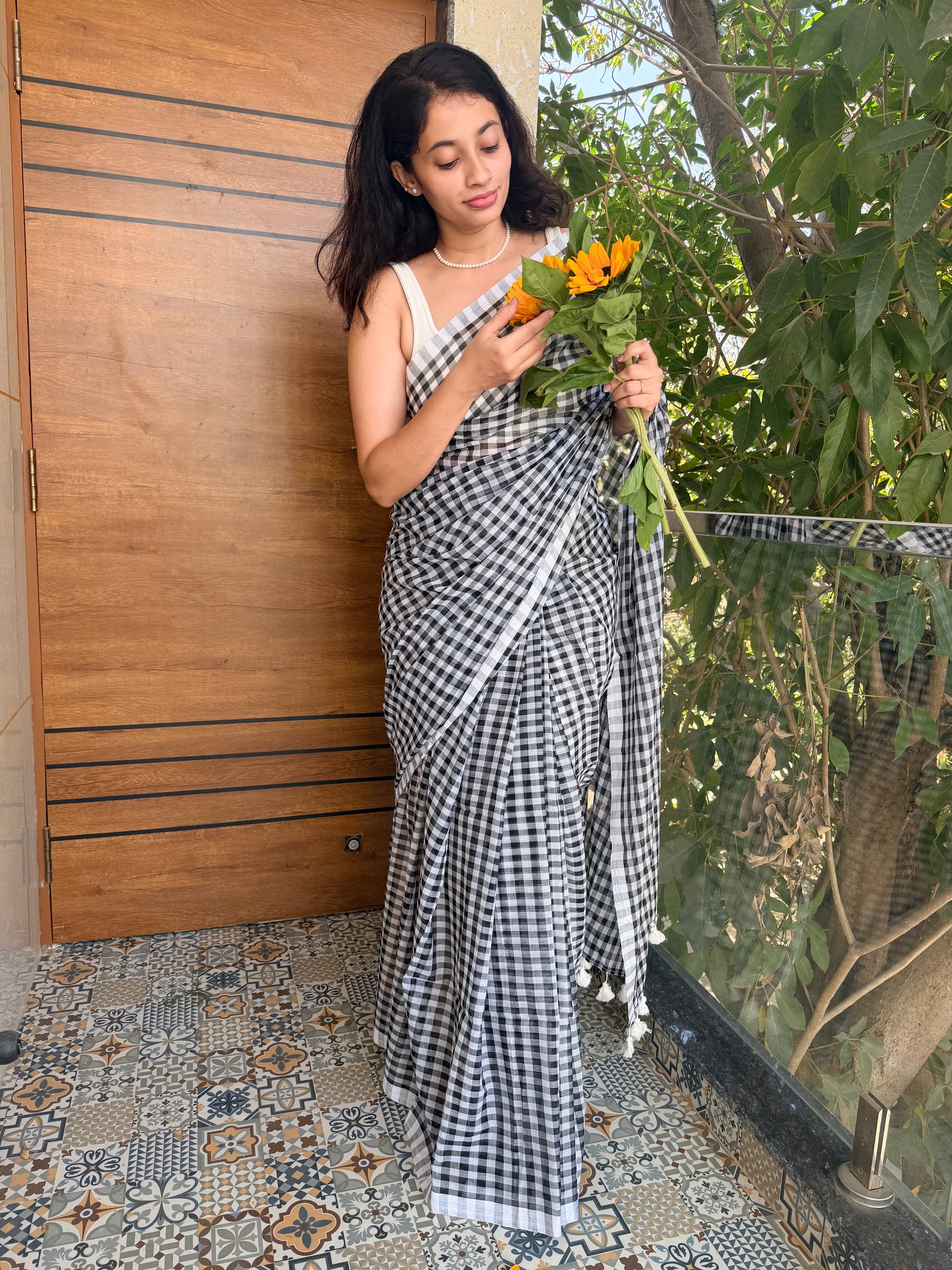 tep into effortless softness with this Pure Mul Black & White Checks Saree, inspired by the timeless elegance of a chessboard. Crafted from ultra-light malmal cotton, it feels feather-soft on the skin and drapes with ease, keeping you comfortable all day long. The bold black-and-white check pattern strikes the perfect balance between classic and playful, making it a standout for breezy days and relaxed ethnic styling.