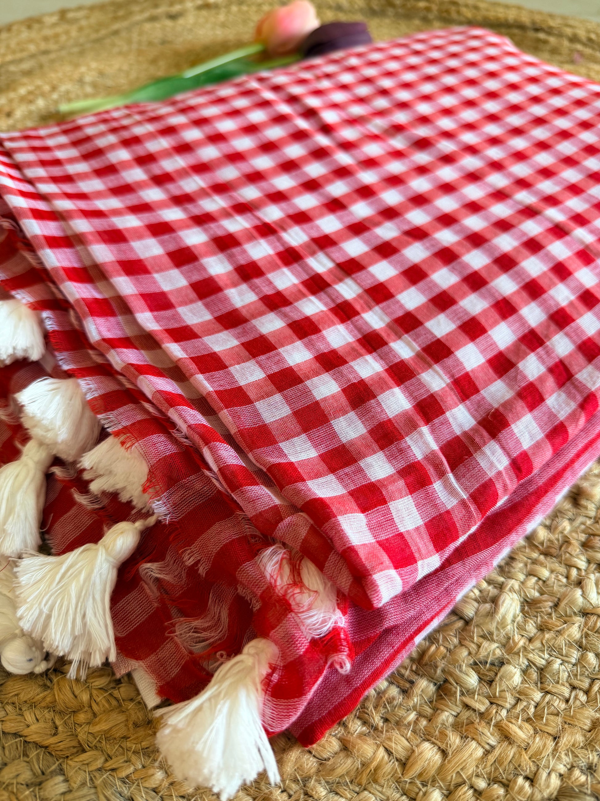 Indulge in the sweet, vibrant charm of the Pure Mul Red & White Checks Saree, inspired by the sun-ripened freshness of summer strawberries. Crafted from ultra-light malmal cotton, this saree feels as light as a breeze and drapes with effortless grace, ensuring you stay comfortable and radiant all day long.