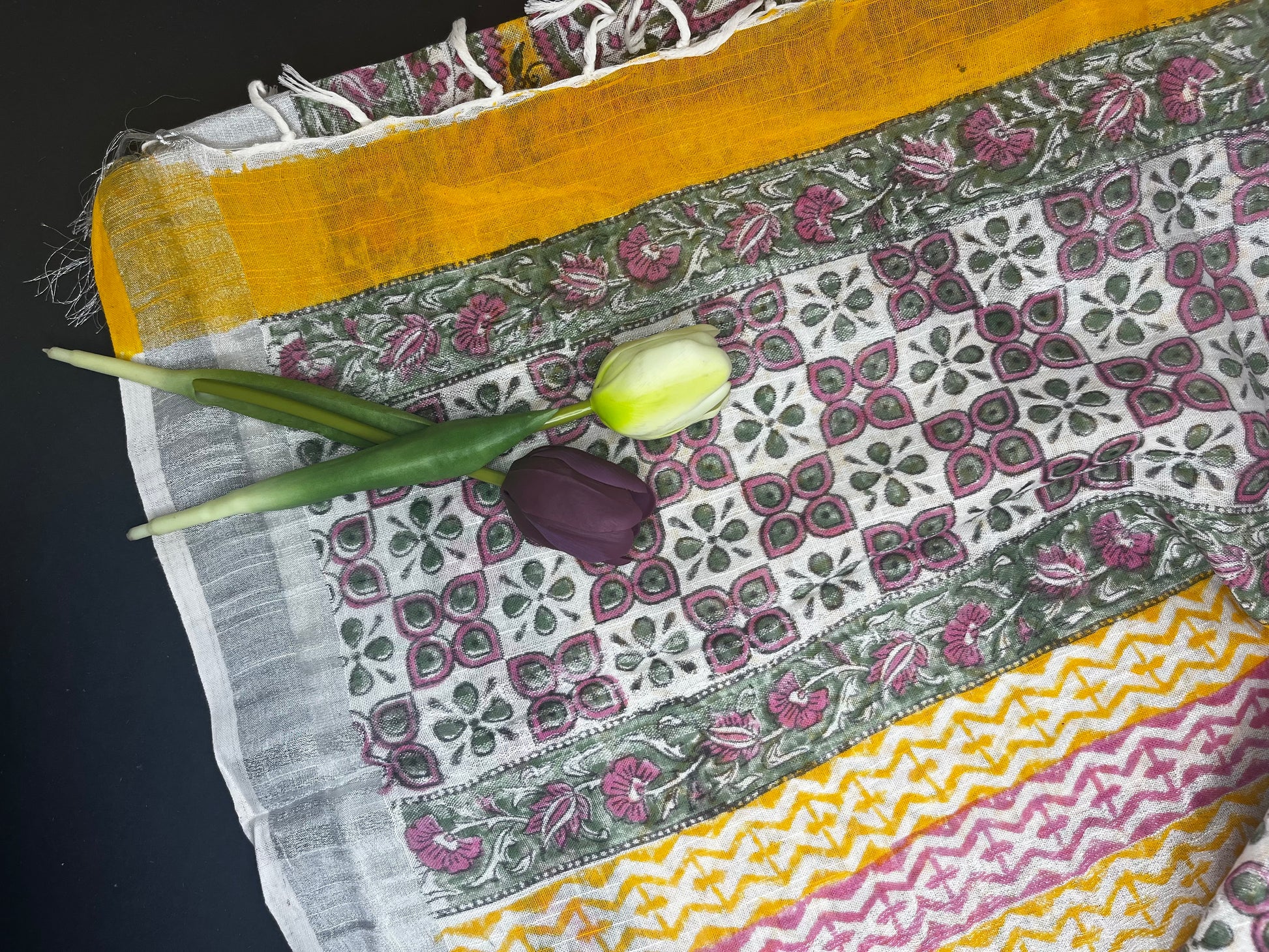 Linen slub floral handblock saree