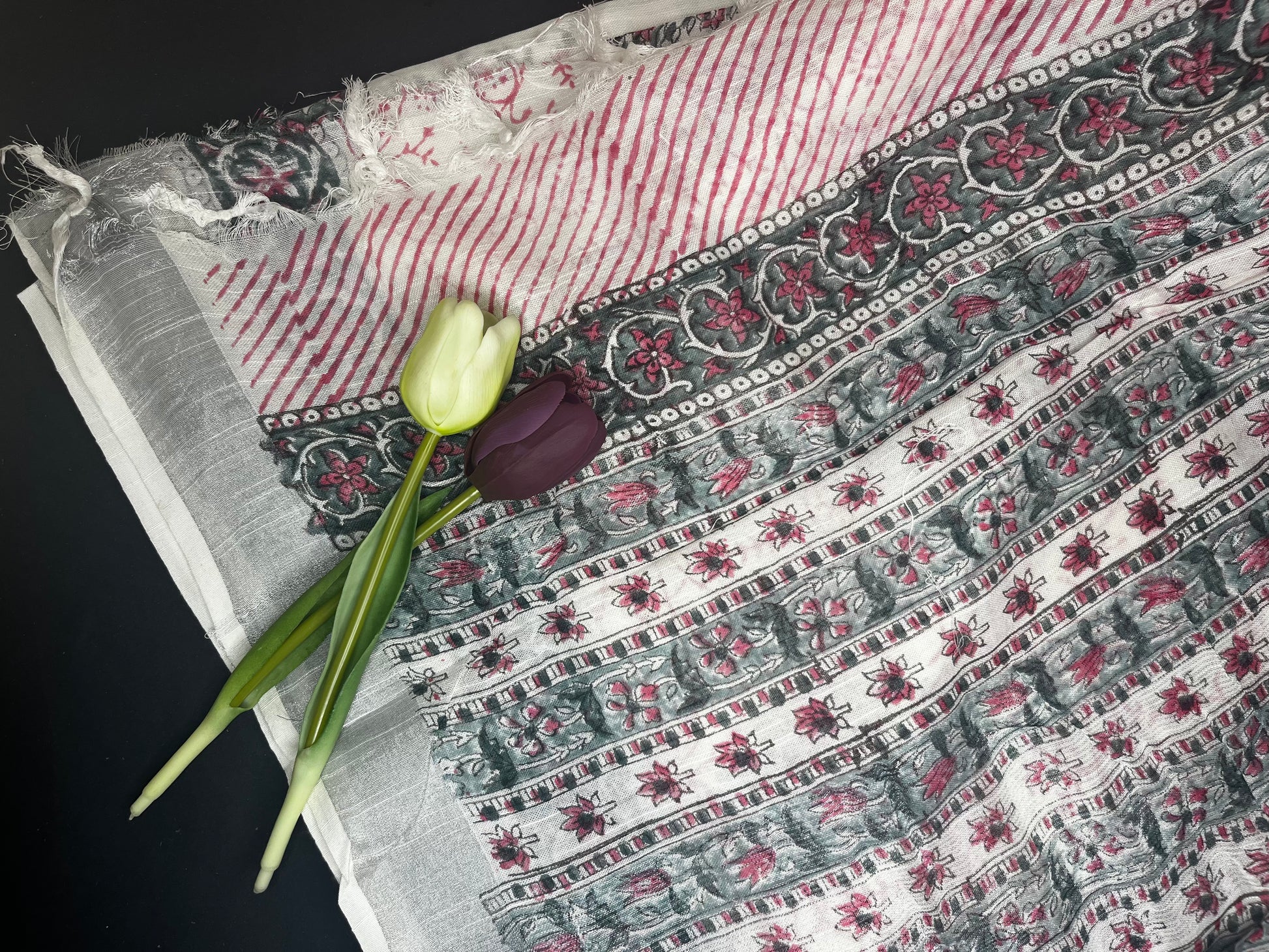 Linen slub floral handblock saree