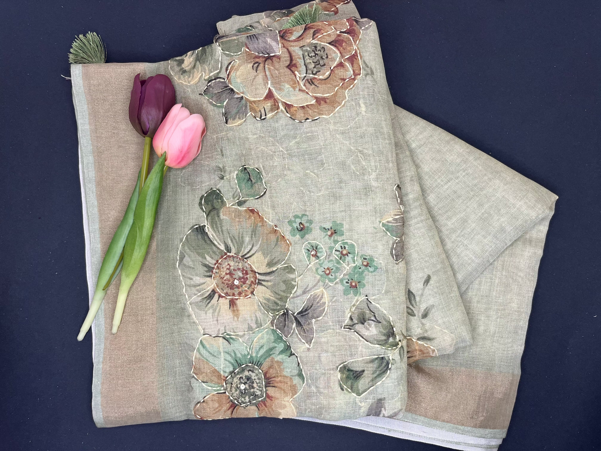 Wrap yourself in artistic refinement with this Premium Linen with Tissue and Kantha Handwork Saree by Kanasu. Blending the airy texture of premium linen with the subtle shimmer of tissue, this saree features intricate Kantha hand embroidery for a rich, handcrafted look. The elegant pastel green tone adds quiet sophistication, making it ideal for artful gatherings, festive occasions, or graceful daywear.