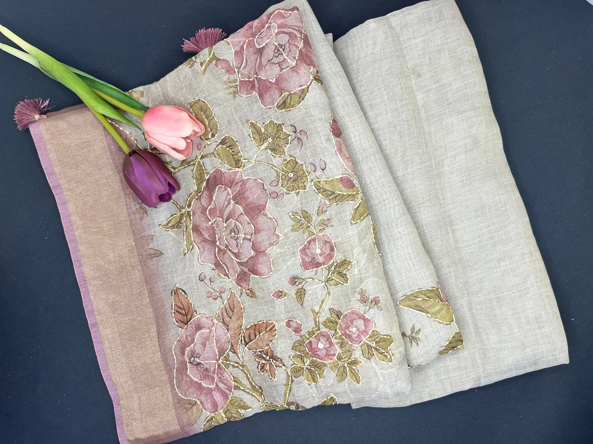 Premium Linen with tissue and Handwork - grey with lilac