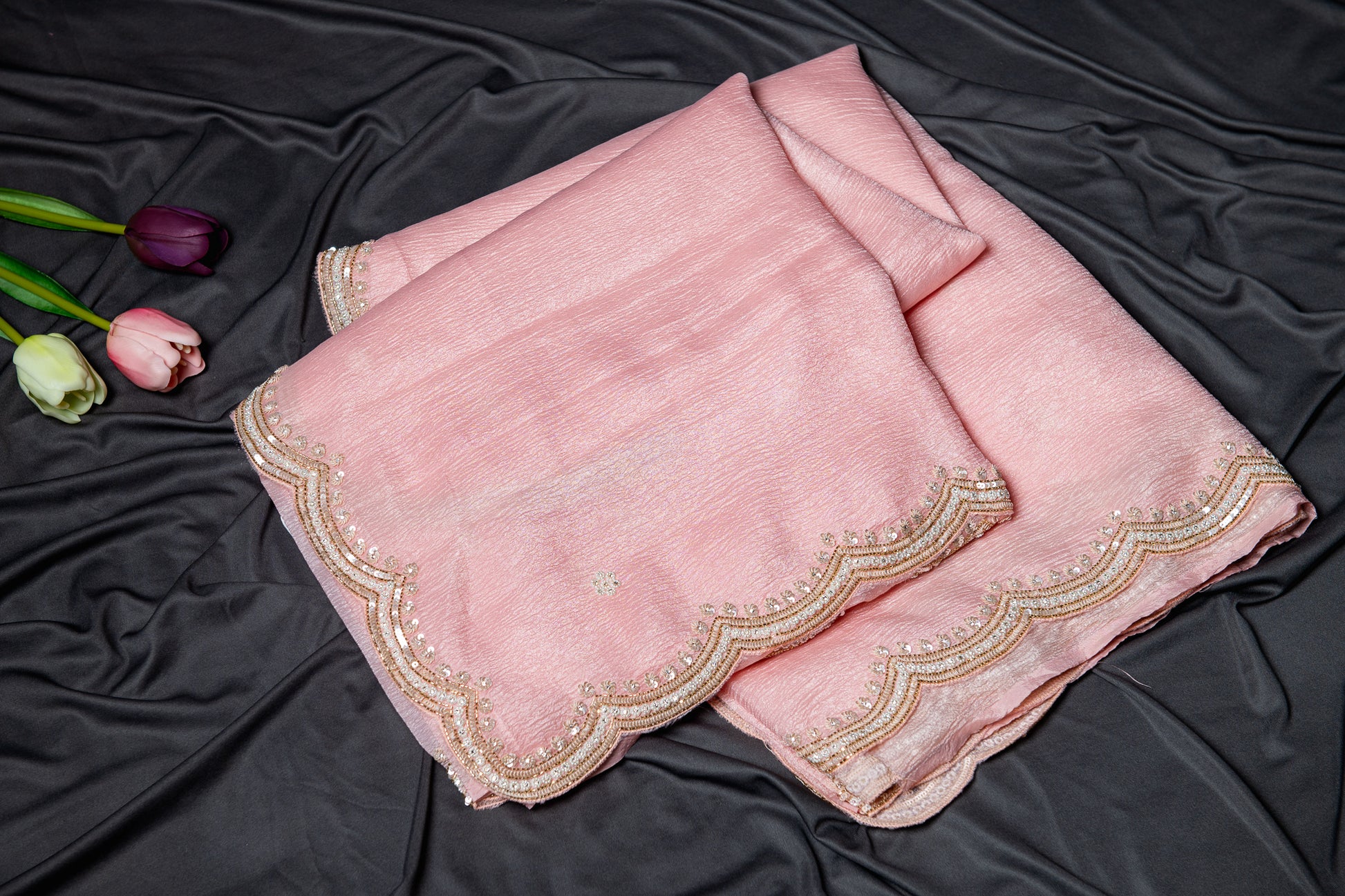 Wrap yourself in delicate sophistication with this Premium Tissue Saree, beautifully embellished with fine hand embroidery. The baby pink hue exudes softness and grace, while the luminous tissue fabric offers a lightweight, ethereal drape—perfect for intimate celebrations, festive occasions, or elegant daytime events.