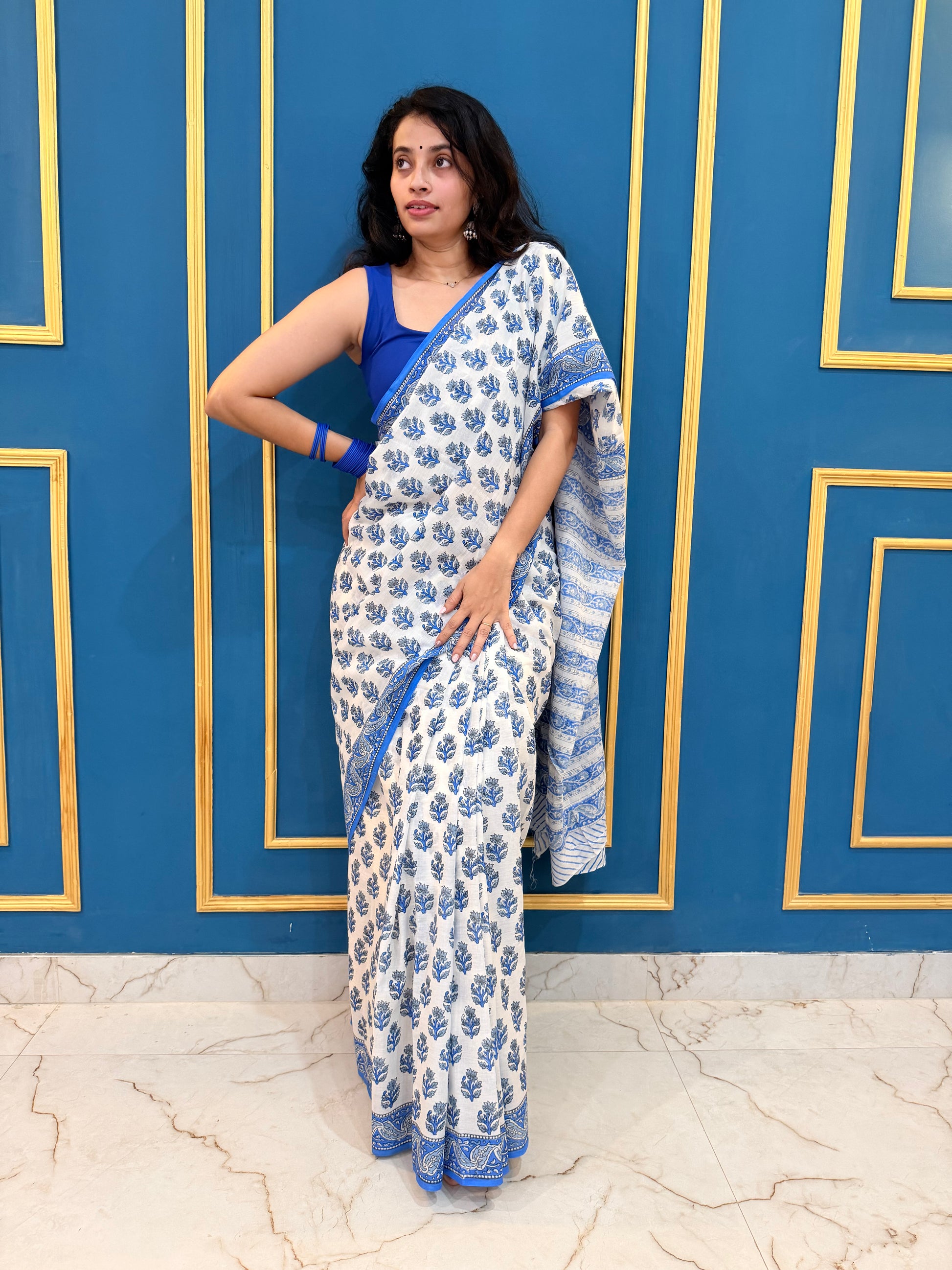 Pure Mul handblock saree - white and blue
